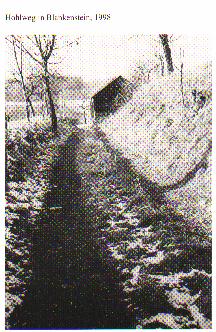 Besonders an Steigungen des Geländes an denen die Pferde schwer zu ziehen und sich mit Ihren Hufen einstemmen mussten, verschwanden die Wege in der Lößlehmschicht. Die Neigung durfte nur so groß sein, daß zwei Pferde ausreichten einen voll beladenen Wagen den Berg hinauf zuziehen. Die Hohlen auf Feldwegen waren gerade so breit, dass ein mit zwei Pferden bespannter Wagen gerade Platz hatten (2m). Der Kutscher konnte oft nur schwer oder gar nicht neben dem Wagen herlaufen. Deswegen gab es in Hohlwegen oft Unfälle, viele tödliche, bei denen der Kutscher vom Wagen überrollt wurde. | |